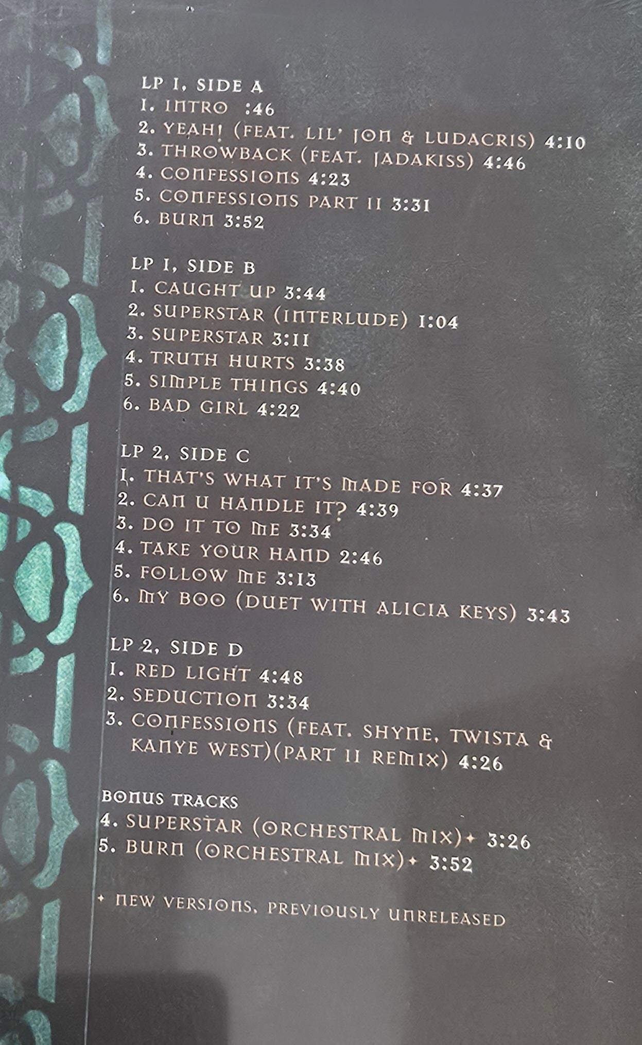 Confessions 20th Anniversary Edition contains alternative album artwork and orchestral versions of "Burn" and "Superstar" as bonus tracks.